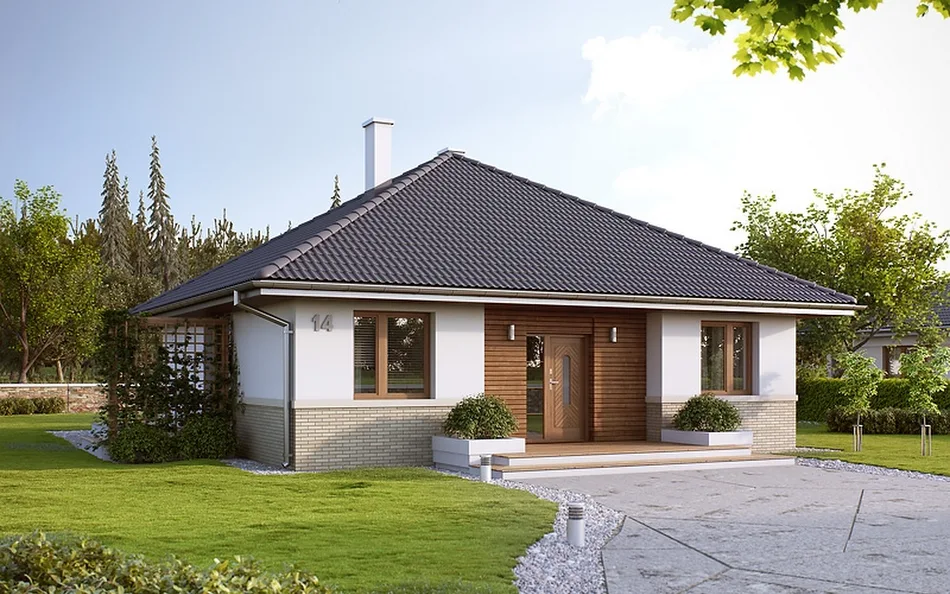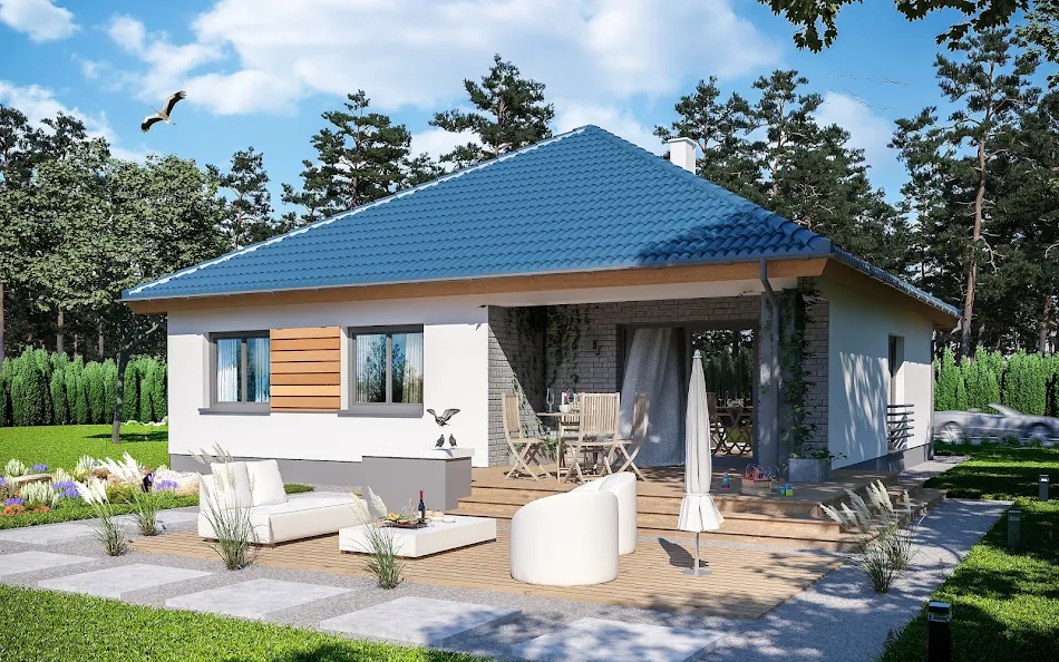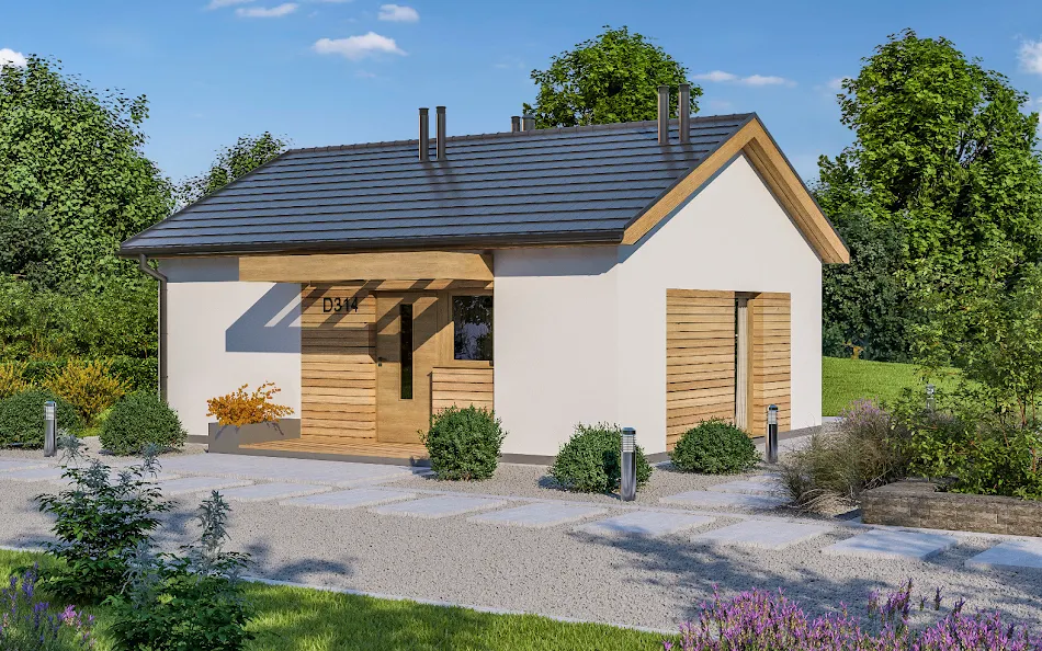 Klasična montažna kuća sa natkrivenom terasom sa strane bašte i svetlim dnevnim boravkom i trpezarijom. Sa kvalitetnim prozorima od poda do plafona. Sa dve spavaće sobe i prostranim dnevnim boravkom. Ukupna površina kuće je 120.91 kvadratnih metara.